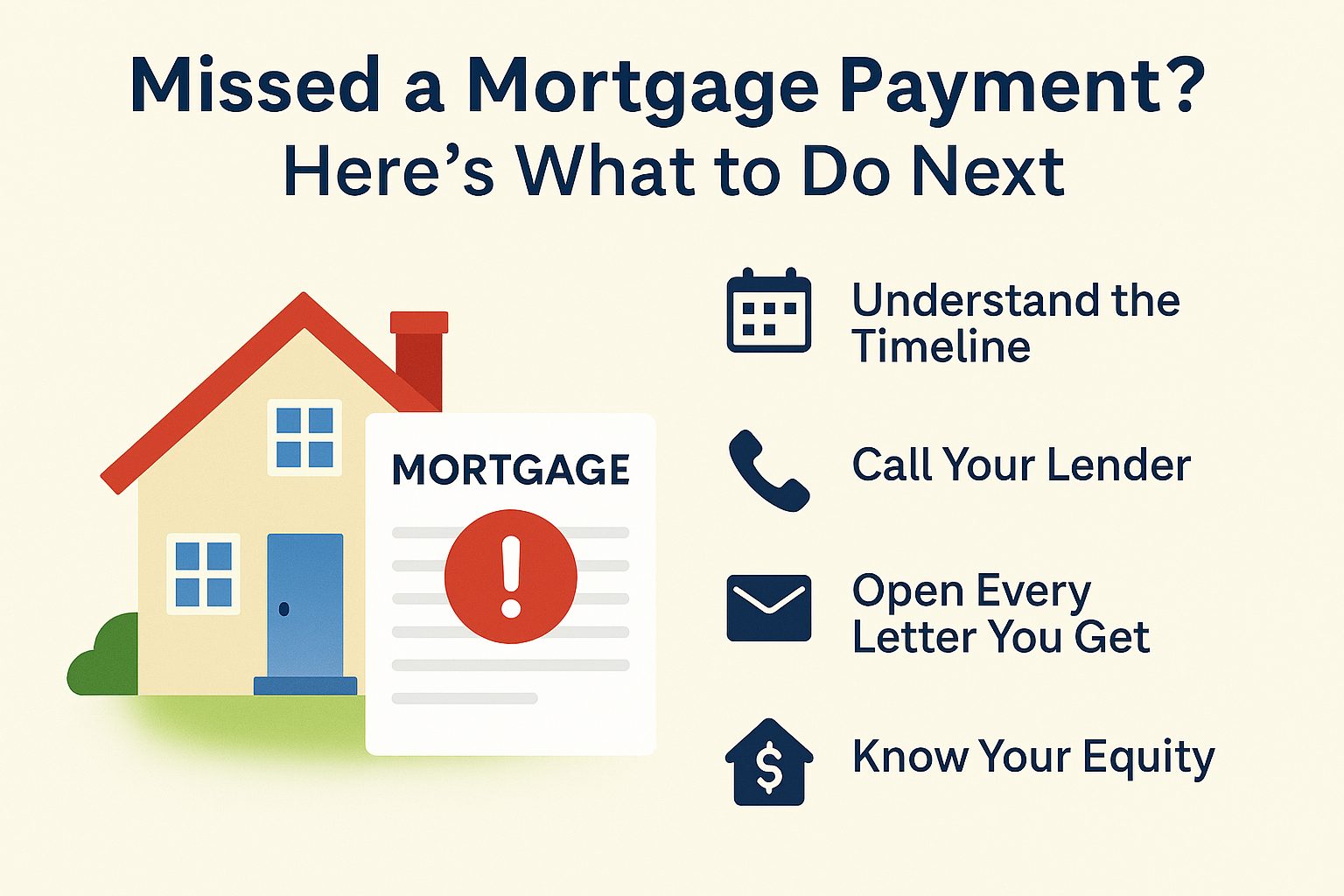 Take a deep breath. One missed payment doesn’t mean you’re going to lose your home. But it does mean it’s time to take action—sooner rather than later.